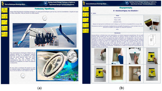 Sample steps of (a) Experimentation and Generalization—Consolidation of knowledge from the digital worksheet showing weightlessness in free fall flight, designs for future space stations recreating gravity through acceleration and (b) instructions on constructing an improvised “Einstein elevator—box”. The rest of the steps are accessible via the left side buttons.
