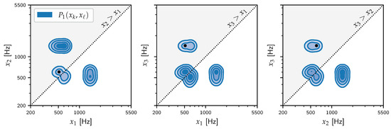 From Figure 2, it can be seen that encodes weakly informative knowledge about K ordered frequencies: (12) and (13) together imply that is defined only for , while nonzero only for . In other words, its support is precisely the ordered region , which solves the label switching problem underlying the conflict automatically, as the exchange symmetry of is broken. This is illustrated in Figure 2, where contracts to a single primary mode, which is just what we would like.