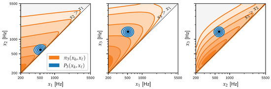 Contraction of prior () to posterior () for the application of to the VTR problem used in Figure 1. The pairwise marginal prior is obtained by integrating out the third frequency; for example, . Unlike in Figure 1, exhibits only a single mode that coincides with the primary mode as marked by the black dot.
