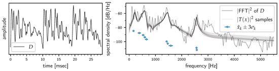 The VTR problem for the case . Left panel: The data D, i.e., the quasi-periodic steady-state part, consist of 3 highly correlated pitch periods. Right panel: Inferred VTR frequency estimates for at 3 sigma. They describe the power spectral density of the vocal tract transfer function , represented here by 25 posterior samples and compared to the Fast Fourier Transform (FFT) of D. All are well resolved, and most have error bars too small to be seen on this scale.