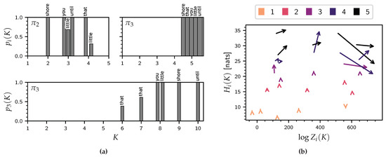 (a) Model selection in Experiment I (top row) and Experiment II (bottom row). (b) In Experiment I, and are compared in terms of evidence [] and uninformativeness [] for each . The arrows point from to and are color-coded by the value of K. For small values of K, the arrow lengths are too small to be visible on this scale.