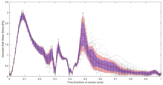 Here, we demonstrate an application where surrogate uncertainties were in part negligible and in part non-negligible. We apply our method to a computational fluid dynamics simulation of aortic hemodynamics, i.e., blood flow in an aorta resembled by the simplified geometry of an upside down umbrella stick. The simulation depends on a non-Newtonian viscosity model with four parameters . The model was accompanied by viscosity measurements of human blood samples, thus determining . This posterior turned out to have a complex landscape that cannot be reasonably approximated by standard distributions. Particularly, strong correlations and multi-modality were observed, i.e., . This means that vanilla Polynomial Chaos Expansions could not be applied without an undesirable transformation to conditionally independent variables. The posterior is described in detail in [20]. Based on , parameter samples were chosen and the simulation evaluated accordingly. The output, , was the absolute values of the wall shear stress that the blood flow exerts on the aortic wall, for measurement probes at different locations, each for time-instances equidistantly spaced over one cardiac cycle (ca. 1 s). Further details on the simulation are not relevant here but are documented [20]. A simulation time on the order of 150 CPU hours per sample suggested to use a surrogate for the inference. For the surrogate’s basis functions, , we found multi-variate Legendre polynomials of up to order two sufficient. The numerical integrals were computed with Riemannian quadrature and convergence checked with successive grid refinement; however, stochastic integration would work just as well. A sketch example on how to implement this procedure computationally efficient via vectorisation in parameter space can be found at https://github.com/Sranf/BayesianSurrogate_sketch.git (1 January 2021).