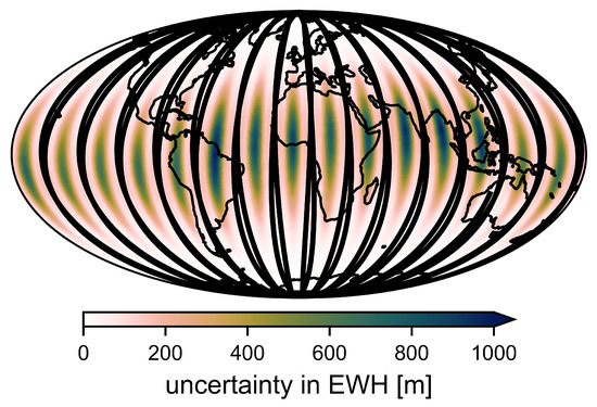 Since we want to determine daily temporal changes in Earth’s gravitational field we set up this least-squares adjustment for a time series , where is 1 day. We denote the resulting observation equations for time step i with a corresponding subscript: . All epochs can be combined in a single least squares adjustment with the block-diagonal normal equation coefficient matrix and the right hand side . Given the block-diagonal structure of we can solve for each time step individually resulting in the estimated parameter corrections and their corresponding variance-covariance matrix . Next to the input data quality, the uncertainty of primarily depends on the spatial data coverage within the observation interval. To recover the full spherical harmonic spectrum, a global homogeneous data coverage is required. For the application here, where the observation time span is a single day, the satellites perform approximately 15 revolutions and thus we can only infer spherical harmonic coefficients up to order [18]. The effect this sparse data coverage has on the estimated gravity field solution can be seen in Figure 1, where we propagated the uncertainty of an unconstrained daily GRACE-FO solution to equivalent water height (EWH) in space domain.