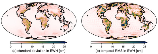 Comparison of (a) the autocovariance matrix derived from the estimated VAR model expressed as standard deviation per grid point and (b) the temporal RMS of the computed gravity field solutions.