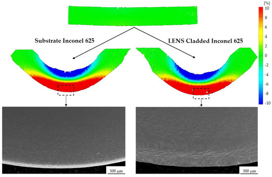 In order to assess the effectiveness of the LENS system during repair of the Inconel 625 specimens, three-point bending tests were performed. The tests were carried out for two types of material: the first one with LENS cladding, and the second with a substrate material. It was observed that the deposited LENS cladded specimens were characterized by slightly higher bending strength (Figure 2). The difference in the mechanical response between both materials in question was approx. 60 MPa. It should be mentioned, that regardless type of specimens, the strain distribution monitored by DIC system during the tests, was similar (Figure 3). In order to assess the quality of the deposited clad after bending, specimens’ sidewalls were polished prior to the test. Microscopic observations did not reveal any surface cracks for both groups of specimens. Additionally, no pores and cracks between the substrate and deposited material were observed for repaired specimen. However, it should be mentioned, that the deformation covered either the deposited zone or the subsequent cladded layers. The mechanical response of the Inconel 625 alloy in its different states resulted from the initial microstructures of these states. The repaired alloy was characterized by a columnar structure in the laser cladding zone while the substrate material remained uniform throughout.
