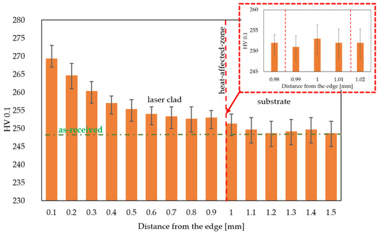 The hardness distribution of the repaired model specimen was measured in the cross section from the top surface to the base metal (Figure 4). The maximum hardness value equal to 269 HV0.1 was observed in the laser cladding zone, and it decreased with increasing distance from the edge of the laser cladding. However, the hardness of the substrate material after deposition remained at the constant level, as that for the as-received material (i.e., approx. 249 HV0.1). It should be mentioned that no significant deviations were observed in the heat-affected zone, since the hardness was kept within the range from 251 to 253 HV0.1.