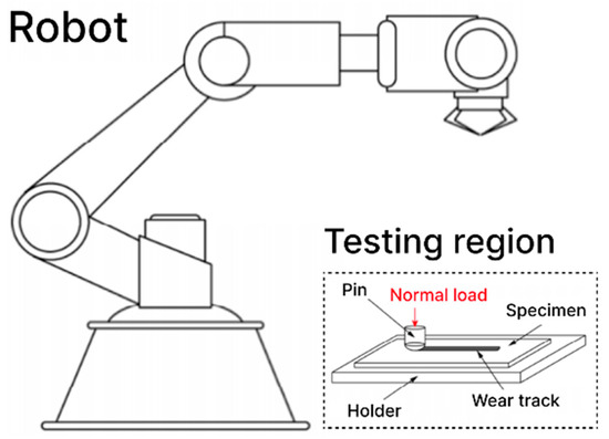Figure 2 shows an automated tribo-testing system, Tribo-Mate [7], consisting of a Universal Robots UR10 robotic arm combined with the pin-on-strip configurations, was used in this work to study the friction evolution under varying dry sliding conditions for quantitatively and effectively evaluating their impacts on the galling behavior. Herein, the Tribo-Mate is controlled by a centralized control unit operating the Robotic Operating System (ROS) [7]. All the other hardware components, including multiple sensors, are connected to this ROS following the commands, and then are controlled to drive the UR10 robot to automatedly conduct the friction tests.