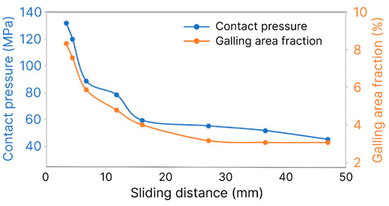 Evolution of contact pressure and galling area fraction during dry sliding.