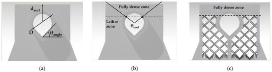 The second step is to divide the die’s body into two zones. The first one is the “fully dense zone”, which is the solid structure, and the second zone is the “lattice zone”, where the designer can selectively change the solid area with any geometry. In this method, the segmentation element is a straight line defined by two points, which are the results of the intersection between the effective cooling angle (θcool) and the cross-section of the cooling channel respectively. The effective cooling angle is the vertical angle of an isosceles triangle formed by the working surface of the tool and the center of the cooling channel [9]. In this study, θcool is set as 360° and 100° degrees for the solid and lattice structured dies, respectively.