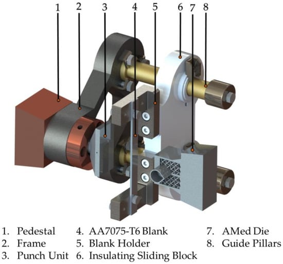 In order to evaluate the performance of the proposed AM dies, an in-house developed testing apparatus was used in combination with the thermomechanical simulator Gleeble 3800 (Poestenkill, New York, NY, USA) [11]. The testing apparatus consists of one pedestal (No. 1 in Figure 4), fixed on one side of the Gleeble 3800 chamber, while the proposed die (No. 8 in Figure 4) is clamped on the opposite side. On the fixed pedestal, a frame (No. 2 in Figure 4) is attached and holds two guide pillars (No. 8 in Figure 4) on which the blank can move horizontally. During a cycle, the specimen die pushes horizontally through the blank towards the fixed punch (No. 3 in Figure 4). The temperature is monitored through K-type thermocouples attached on both the blank and the die, and the data are stored in the Gleeble controller in order to be post-processed at a later stage. Moreover, the heating of the blank is realized by induction heating at a heating rate of 30 ℃/s. Finally the die is cooled by circulating water through the cooling channel. A Reynolds number of 4000 to 10,000 could maintain turbulent flow in the cooling fluid, which has far superior heat transfer properties than that of laminar flow [9]. Thus, the target Reynolds number was 8000 in this research, and the corresponding water flowrate of 0.105 L/s was controlled using a flowmeter. The temperature of the water was set at 25 ℃.