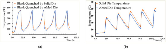 The critical cooling rate (CCR) of the blank material is achieved in every hot stamping cycle. However, the lattice structured die achieves a significantly higher cooling rate than the solid die, as can be seen in Figure 6a. Another observation is that the cooling rate of the solid die at cycle 5 is just above the CCR, which means that in a scenario of more loading cycles, it would likely fail to meet this CCR requirement. Moreover, magnified graphs of blank temperature evolution for the first and last cycle of each die are presented in Figure 6b,c. It is clear that the two cooling curves are diverging as the stamping cycles increase, which is expected due to the thermal history of the dies.