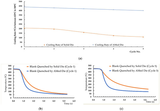 (a) Cooling rates of the blank for each cycle; (b) blank temperature evolution—1st cycle; (c) blank temperature evolution—5th cycle.