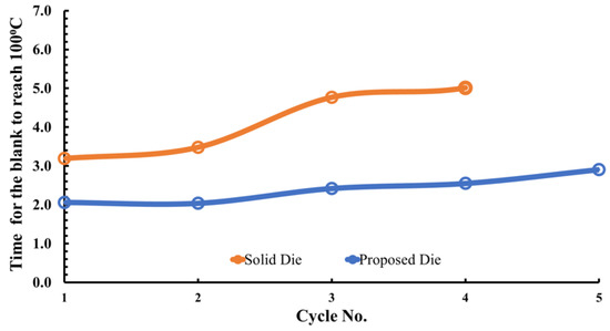 Figure 7 shows the time required for each die to cool down the blank to 100 ℃. Overall, both curves follow the same trend with the increasing loading cycle. The lattice structured die quenches the blank to 100 ℃ faster, by approximately 30–50%. It is worth mentioning that the blank quenched by the solid die in the 5th cycle failed to reach the desired temperature in 5 s.