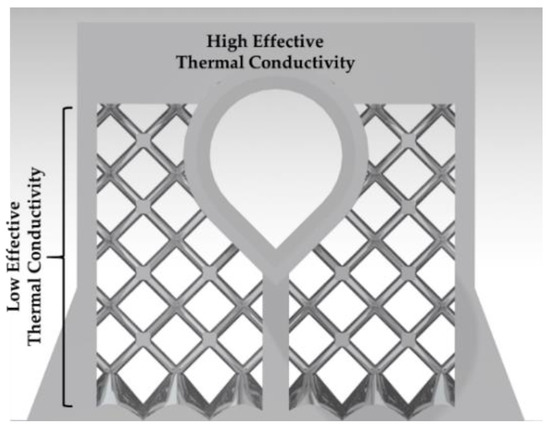 It can be concluded that lattice structures eliminate the majority of the metal mass from the die while providing mechanical support to the working surface. It is found that while heat transfer between the die working surface and cooling channel is unaffected, heat transfer from the cooling channel to the body of the die is greatly reduced, because of the decrease in thermal mass and increase in thermal resistance that the lattice structure provides. Consequently, the thermal mass, which must be cooled down by the cooling channel, is now reduced to 50% of the “fully dense” zone, as shown in Figure 8, thus making rapid thermal cycling of the die surface possible.