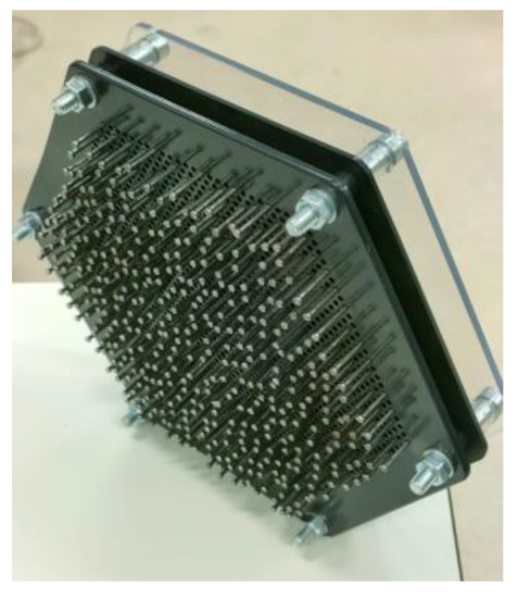 Therefore, in this work contact marking was chosen. In addition, the operation of the contact thermal marking tools is very simple since it will only be enough to press them against the surface for a certain time that will depend mainly on the material of the part to be marked. For this, a marking tool was designed which can be adapted to complex shapes. This tool consists of three polymer sheets, which guide a system of randomly distributed metallic rods of 2.5 mm of diameter, which have 15 mm travel along their axis. This travel enables a good adaption to the complex surface of the specimen. This tool was placed on a heated surface to maintain at a temperature of 50 °C and then it is applied on the studied surface. This thermal speckle application tool is observed in Figure 1.