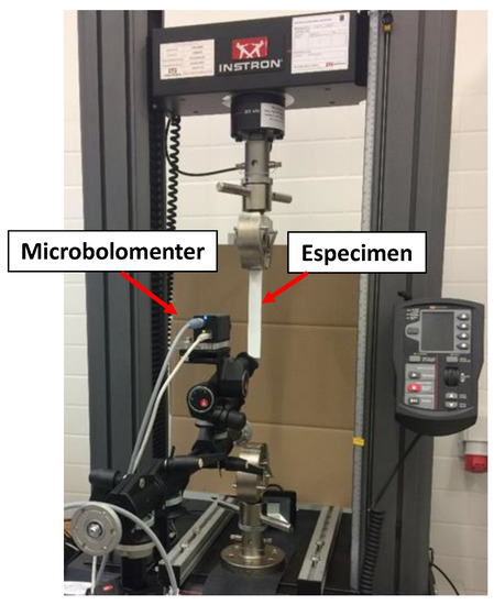 Additionally, for the second set of solid rigid tests, on the other side of the specimen, a traditional visible spectrum camera registered images at the same time in order to compare the results and validate the proposed approach. Specifically, an Allied Vision Mako U U130B with a resolution of 1280 × 1024 pixels and 25 mm focal length lens was used. With this set-up, the magnification relation obtained was 14.29 px/mm. The images obtained with this experimental methodology were processed using Ncorr software [8] employing a subset size of 12 pixels and 17 pixels for microbolometer and visible images, respectively. In this way, the experimental set up is presented in Figure 2.