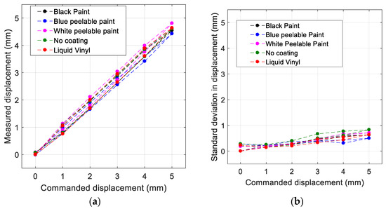 Figure 4 shows the evolution of those displacements measured along each step for each of the different surface coatings. As can be seen, the displacement measurement is quite similar for all the coatings. However, it is true that all of them tend to measure less displacement than the real one. This is especially noticeable for larger displacements and for the type of paint called ‘Blue Peelable Lacquer’. This may be due to the fact that the paint makes the Speckle pattern vanish more quickly. By observing the standard deviation presented in Figure 4b, it was noticed that this value reached up to 0.8 mm, with a similar value for all the coatings, so no special difference was observed. Even so, it was observed that the results of the White Peelable Lacquer and the unpainted polycarbonate are quite close to those commanded. Specifically, there were differences of 0.27 mm for the White Peelable Lacquer 7 s after the marking and 0.39 mm for the polycarbonate specimen without any type of surface finish 6 s after the thermal marking. These are considered good results, taking into account the resolution available.