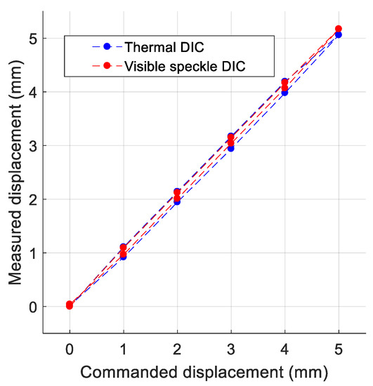 The comparative results are shown in Figure 5. As can be seen, the difference between the displacement value commanded by the machine and that obtained with thermal and visible DIC is 0.19 and 0.17 mm, respectively. However, taking into account that the uncertainty of the DIC is a function of the resolution [1], the uncertainty of the thermal camera is logically greater than for the visible spectrum camera.