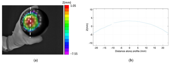 Results for digitalization a rubber ball. (a) Image of digitalization. (b) Shape profile along whit dashed line in (a).