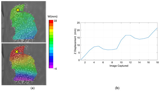 Focusing on applications related to biomechanics, a first test was performed in the abdominal area of a human. During the test, the duration of which was around 5 s, the person forced an expansion of the abdominal area, followed by a compression of it. As a consequence, in Figure 7a, the out-of-plane displacement maps were observed, measured in an area of approximately 100 × 140 mm. The yellow cross indicates the point analyzed in Figure 7b, where the out-of-plane displacement was studied along time. In this graph, the red dashed line indicates the moments associated with the displacement maps in Figure 7a.