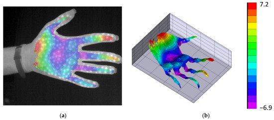 An additional test for determining shape was performed on a human hand. In Figure 8a, the image captured by one of the microbolometers is presented, upon which the shape map is superimposed. This shape map is shown in 3D in Figure 8b.