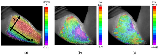However, previous tests employing 3D DIC do not exploit all the potential of the technique in biomechanics. In the next test, we were interested in the measuring of strains on the skin of the human body. For that purpose, the strains during arm flexion were analysed. Figure 9a shows the shape of the arm in a straight reference state. As observed, a specific coordinate reference system was chosen to facilitate the interpretation of results. In fact, the X-axis was considered the longitudinal direction of the arm and the Y-axis was the transversal one. In next figure, Figure 9b, the strains along the former axis are shown. As observed, some tension was presented in the main area of the bicep muscle, but what is more notorious is the compression in the area where the bicep muscle joins the area of the elbow. In Figure 9c, a strain map in the direction transversal to the humerus is presented. It was noticed that the strain along that axis was associated with tension in the area of the biceps, and that this is significant. Some tension in the skin close to the elbow was also observed.
