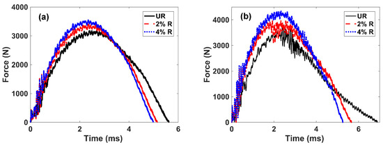 Representative force histories associated with 7.5 J and 12.5 J impact energies are shown in Figure 1a,b, respectively. The bell-shaped curves exhibit higher undulation when rising compared to when they fall. The prominent peaks at the start suggest damage initiation and/or damage propagation in the laminate. The force associated with the first peak is tabulated in Table 1 and was identified as the first failure in the laminate [8]. While the first failure load increased with increasing impact energy, the reinforcement appears to have had no influence on the failure initiation (see Figure 1). The impact force reduced to zero when the impactor rebounded and ceased to be in contact with the laminate. The plots show that the contact duration of the impactor decreased as the reinforcement in the laminate increased. In addition, the maximum force sensed by the laminate increased with increasing reinforcement. The force histories associated with the 12.5 J impact (Figure 1b) exhibit large oscillations around the peak force in the unreinforced and 2% R laminates. This indicates delamination, with significant damage to the laminate. On the contrary, a relatively smoother transition from the ascending to the descending part of the curve suggests a higher resistance to damage in the case of the 4% R laminates.