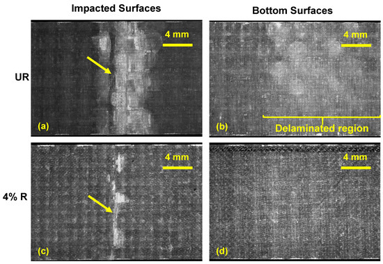 The surfaces of impacted beam samples were imaged using optical microscopy to analyze the extent of damage, as illustrated in Figure 3. The impact locations are marked by arrows. Figure 3a, b show the damage on the impacted surface and on the back surface, respectively, for the 12.5 J impact energy case. The bright area near the impacted site in Figure 3a suggests localized micro-buckling at the top lamina due to compressive stress. On the other hand, the bright area at the back face indicates delamination failure. A relatively smaller damage area was observed for the reinforced laminate at the impacted face as well as at the back face, as depicted in Figure 3c,d, respectively. At lower impact energies, less damage near the impact line, as well as on the back surface, was noticed.