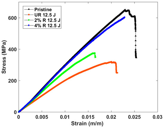 Stress–strain plot of various laminate samples, including an unimpacted neat epoxy sample.