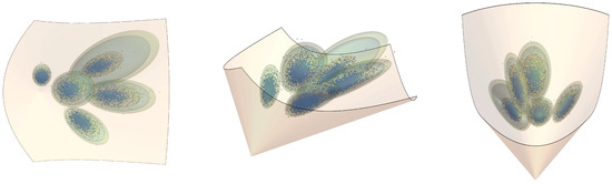 Visual representation of the Riemannian Gaussian model estimated from 10,000 observations from three vantage points: top view (left), side view (middle), and front view (right). Each SPD-valued observation is plotted as a point in the interior of the pointed convex cone . The shaded compact regions within the cone are superlevel sets of the 5 estimated Riemannian Gaussian densities that represent the observation likelihoods.