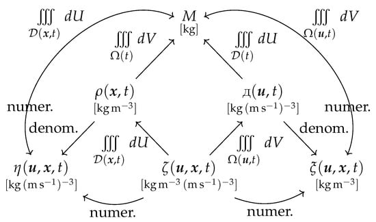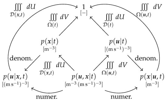 Philosophically, these pdfs can be interpreted as measurable frequency distributions, or more broadly as Bayesian probability distributions subject to the sum and product rules of probability theory []. Defining for an infinitesimal volume element and for an infinitesimal velocity element, the five pdfs will by definition satisfy the nine relations: