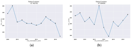 Example of two companies rated by Tinubu Square every year during the period 2008–2019. The EVL_LEVEL represents the score given by Tinubu before it is mapped to a rating class. The FIN_STATEMENT_DATE is the date that the company published its financial statements. (a) Rating evolution of the company 462792. (b) Rating evolution of the company 684690.