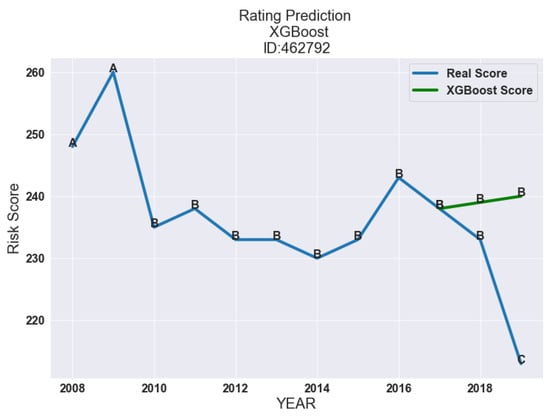 As we can see in Figure 4, the XGBoost showed that the company with the ID 462792 will slightly improve during the next two years. The rating given by Tinubu and the rating generated by our XGBoost model diverged for the year 2019. This difference can be explained by the fact there was an event that adversely affected the company’s activity.