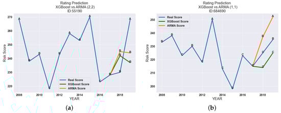 Comparison of the forecasted Tinubu rating for the period 2018–2019 for companies 55190 and 684690, respectively, using the proposed models in this work: ARMA and XGBoost. (a) Predicted rating evolution for company 55190. (b) Predicted rating evolution for company 684690.