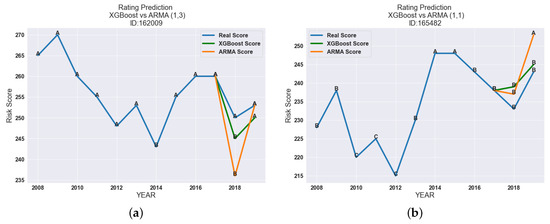 Comparison of the forecasted Tinubu rating for the period 2018–2019 for companies 162009 and 165482, respectively, using the proposed models in this work: ARMA and XGBoost. (a) Predicted rating evolution for company 162009. (b) Predicted rating evolution for company 165482.