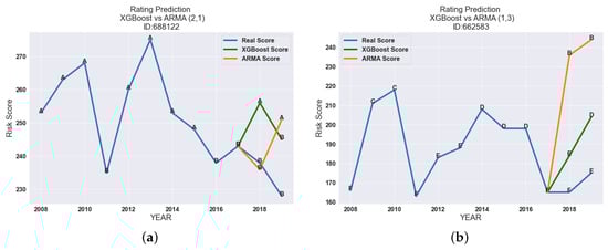 Comparison of the forecasted Tinubu’s rating for the period 2018–2019 for the companies with the ID 688122 and 662583 respectively using the proposed models in this work: ARMA and XGBoost. (a) Predicted rating evolution for company 688122. (b) Predicted rating evolution for company 662583.