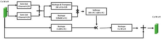 The spatial attention module highlights the important region of the image. The proposed spatial attention module is shown in Figure 4. We applied two convolution layers, one’s kernel is 1 × k and the other’s is k × 1, to increase receptive field and represent global features without increasing parameters. We used a correlation matrix that represents the relationship of features in any two positions, with similar features being able to contribute to mutual improvement regardless of their distance in the spatial dimension. We proposed a multi-scale attention module that contains a lot of details from low-level features and global information from high-level feature maps.