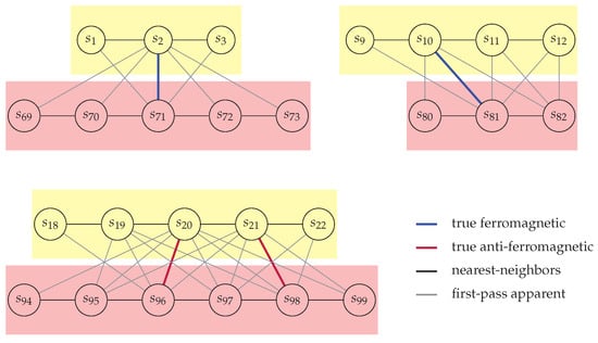 Graph representation of the three spin clusters found over the first pass of constraint selection within pairs of spins. The gray lines represent erroneous non-local interactions, while the actual (anti)-ferromagnetic long-range interactions are signified by blue (red) lines. Among all non-local associations found in the first pass, only true interactions remain significant in the subsequent constraint selection within the three clusters, at least away from the strong coupling regime.