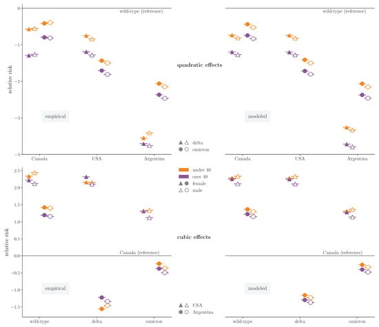 The upper-right plot clearly demonstrates the pairwise associations between wave and the other three dimensions. During both delta and omicron waves, there exists an overall country-specific decrease of the log-rr. Independently of the country, a further decrease is observed due to older age and in turn, independently of age, the log-rr decreases in male patients. On the other hand, the plot below shows the three-point association among age, sex and country. While for Argentina the maxent model recognizes again independent shifts in the log-rr for age and sex over the waves, in the USA the three-point effect becomes significant: A male patient over 40 has significantly lower rr than a female patient of the same age, while the picture is reversed at younger ages. Hence, solely specifying either age or sex in a profile from the USA is not enough to tell the exact change in rr around the overall wave-specific estimate. Of course, choosing another country as reference would lead to identical conclusion, demonstrating the natural reparametrization invariance of maxent constraint selection.
