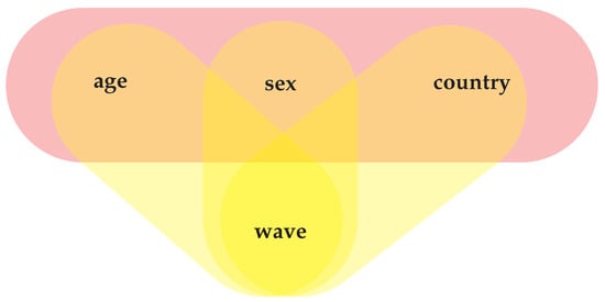 Generally, we recognize from the rr reduction in the upper-left plot that the first wave appears to be the most dangerous for all profiles in all three countries. From the lower plot on the left, we see a rr increase in the profiles from the USA compared to Canada over all waves, while the corresponding relative risk of profiles from Argentina fluctuates over the waves around the reference line. To systematically resolve significant differences in the various risks from accidental fluctuations biomedical research tries to uncover associations between the features under investigation. Starting from  and the empirical distribution, we progressively remove constraints and compare models defined over the  microstates. After classifying all possible architectures , there significantly remain three pairwise associations and one cubic effect depicted in the hypergraph of Figure 3. Incidentally, the same hypergraph exhibits the lowest Bayesian Information Criterion,