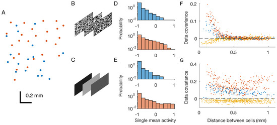 Retinal multi-electrode array experiments. OFF neurons and OFF–OFF pairs are in red, ON and ON–ON pairs are in blue, and OFF–ON pairs in yellow. (A) Physical positions of the recorded neurons within the two-dimensional retinal output layer. Each dot correspond to a neuron. (B,C) Two considered stimuli are checkerboard and full-field flicker. (D,E) Distribution of single neuron mean activities. (F,G) Pairwise covariances as a function of the physical distance between the neurons.