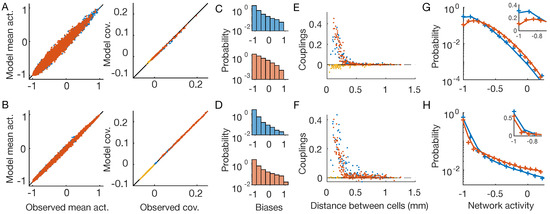 Time-dependent Ising model. OFF neurons and OFF–OFF pairs are in red, ON and ON–ON in blue, and OFF–ON pairs in yellow. The first line show results for the checkerboard stimulus, the second for the full-field one (Figure 1B,C). (A,B) Inferred time-dependent IM reproduces the neurons’ mean activities and covariances with high precision. (C,D) Distribution of the inferred biases . (E,F) Inferred pairwise couplings J as a function of the physical distance between the neurons. (G,H) Empirical (plus signs) and model-predicted (lines) probability distributions of the network activity of the two neuron populations. Inset: zoom in linear scale.