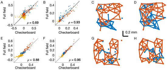 Structure of the inferred couplings. OFF–OFF couplings are in red, ON–ON in blue, and OFF–ON in yellow. (A) Scatterplot of the inferred couplings for the two stimuli in the inverse IM. (B) As (A), but for the time-dependent IM. is the Pearson correlation. (C,D) Interaction lattice after thresholding the inferred couplings of the time-dependent IM for the checkerboard (C) and full-field stimuli (D). (E–H) the same as (A–D), but for a second example experiment where retinal neurons responded to the same visual stimulations.