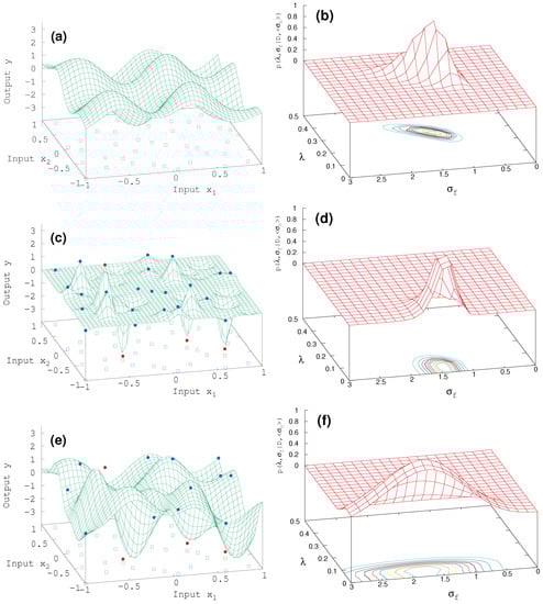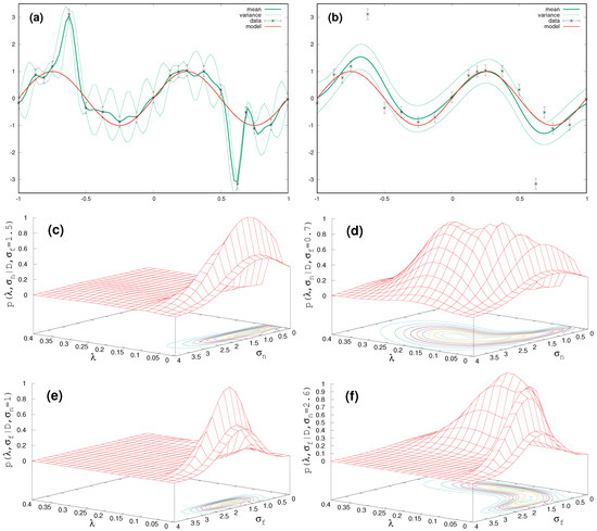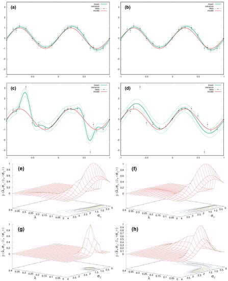 From the above, it is clear that an MAP-solution would fail completely in the presence of outliers, because such an approach would focus on the maximum of the probability distribution at = 0.051 and = 1.61, thereby disregarding all contributions from the PDF for larger along with smoother surrogates. Consequently, only the full exploitation of the marginal likelihood Equation (6) empowers the result to resemble the sin-function.