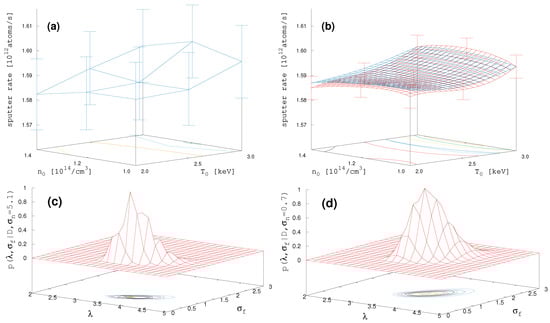 In order to improve this apparently not very informative result on only a grid, we calculate the GP surrogate on a -grid and take the data, being the worst in terms of variance, feed them back to EIRENE and take the resulting second = 81-data set (containing 11 doublets from initial one). This results in the initial one adding up to a total of data points. One can think of this as an iterative step, keeping the computation effort of the costly EIRENE runs low. The surrogate surfaces for the initial data set with N = 81 EIRENE data (blue mesh) and the full data set with = 151 (red mesh) are shown in Figure 4b, with the errorbars for the same nine data points as in Figure 4a. As can be seen, the iterative step reduces the uncertainty in the target by a factor of 3.6 (and misfit by factor of three). Moreover, while the surrogate surface (blue mesh) based on initial N = 81 EIRENE data shows only a maximal structure at keV smeared out around /cm, the TP-surrogate surface (red mesh) has a clear maximum at keV and /cm. The lower panel of Figure 4 shows the marginal likelihood surfaces for the hyperparameters , for the results with N = 151 data. Since the TP-method (Figure 4d) shows a broader shape compared to the GP-method (Figure 4c), it may be inferred from the chapters above that the four-dimensional parameter space contains results for the sputter rates which do not fully obey a normally distributed uncertainty.