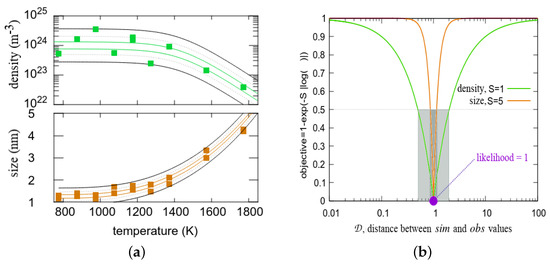 where represents the mean on OKMC simulations for one and where a density of probability of the error is assumed to be proportional to . Notice the logarithm introduced in Equation (6) and S equal to 1 (respectively, 5) for (respectively, ) in Equation (7), to strengthen the attachment to the data compared to (see also Figure 1b).
