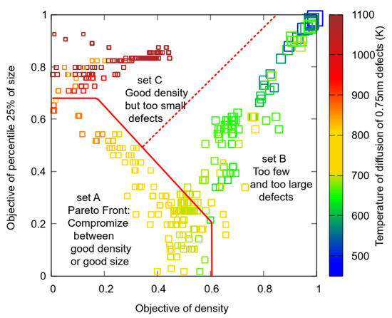 The search of the Pareto front in the dimensions appeared to be meaningful as we will describe in Section 4. Finally, to determine the optimum parameters, we tested a of the objectives in the space of parameters based on the physics of the OKMC. The matrix is the function of the parameter :
