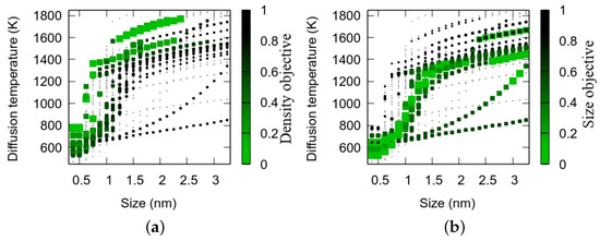 Figure 4 show the projected objectives of the Pareto optimal solutions in the space of parameters. The objective vector is split in and objectives component, then projected to the size classes which diffused during the considered temperature stage, because they are more likely to be the cause of the good or poor objective than the other size classes. We observed that the diffusion temperature, which increases with the nanocavity size, has to increase more rapidly to optimize than to optimize objectives.