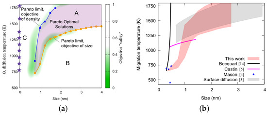 (a) Pareto front and Pareto optimal solution projected in the parameter space, diffusion temperature, , as a function of the nanocavity size. Stars on the y axis indicate the annealing temperatures, . (b) Comparison of our results with literature.