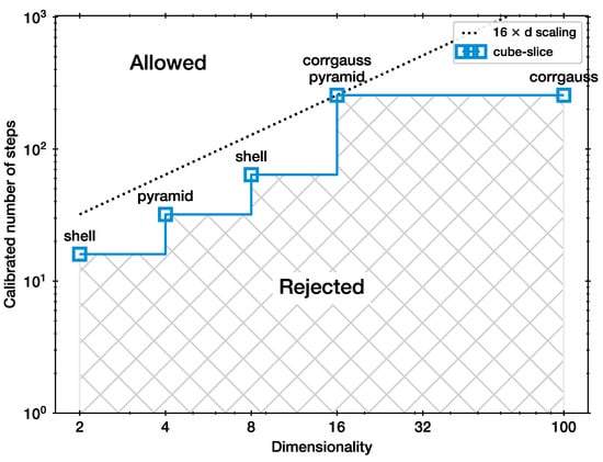 To start, Figure 1 presents the calibration results for the cube-slice method. The needed for each problem is shown by the blue curve. In this case, the needed to be doubled or quadrupled for all but the last increase in dimensionality. Configurations to the bottom right of this curve are rejected because biases in the shrinkage distributions were detected. Configurations in the upper left including the blue squares are still allowed, but may be problematic in geometries other than the ones considered here. The dotted black line shows the minimal scaling law that avoids the rejected configuration space.